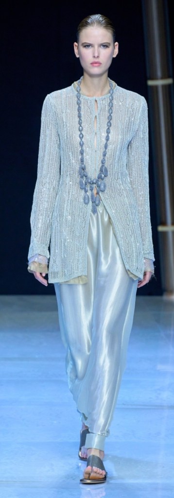 The Spring Summer collection 2023 by Armani was enchanting and wonderful as always. Giorgio Armani lives true to himself with very recognizable designs that remain within a clear stylistic sign, where lightness and natural elegance are predominant. Fil d’Or (Golden Thread)- the name of Giorgio Armani’s collection – alludes to the abundancy of sparkle, from the use of both shimmering and luminous materials and details, to bring, as the designer says, a little light in these turbulent days. But it is a soft sparkle, not a loud one, consistent with the classicism and the delicacy that has always distinguished the brand. The Armani show presented more than fifty looks, with elongated silhouettes, fluid lines, in soft and lightly coloured looks, both in the typical Armani’s neutral tones, as sand and pale grey, and in an unexpected declination of the blue colour in different shades.